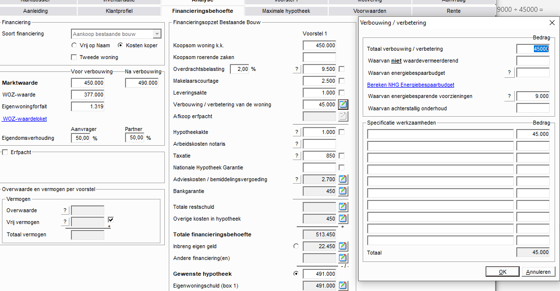 Tel het verkregen bedrag bij de marktwaarde voor verbouwing op om de nieuwe marktwaarde te bepalen (voorbeeld: 41.000 + 450.000 = 491.000).